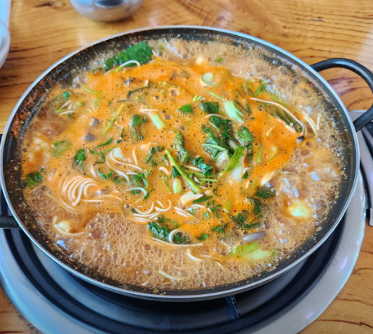 - 얼큰하고 진한 고추장 베이스 국물, 수제비·국수 사리 추가 가능