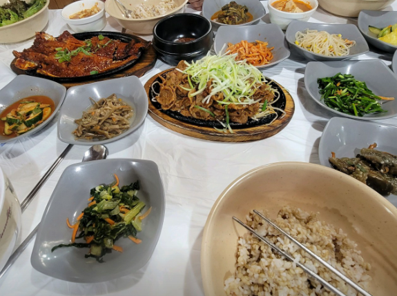 건강한 보리밥에 푸짐한 밑반찬 구성