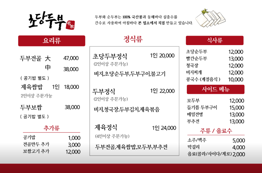 심지어 두부와 순두부는 100%국산콩과 동해바다 심층수를 간수로 사용하여 아침마다 만든다고 하시네요!