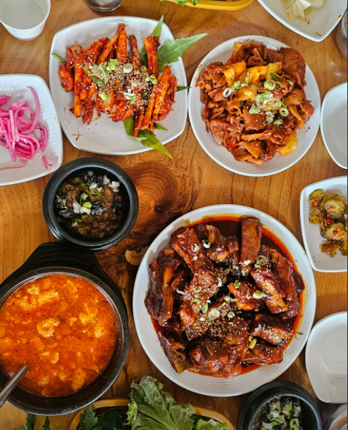 청국장우렁이쌈장, 갈비찜, 순두부찌개, 쌈야채 무한제공