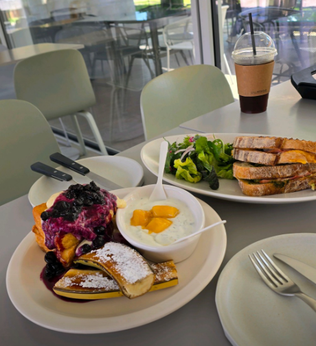 한라봉크림, 토스트, 앵글레이즈소스, 블루베리, 바나나, 믹스그린 샐러드, 드레싱